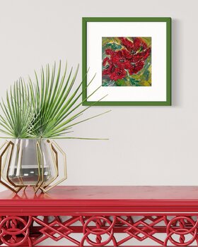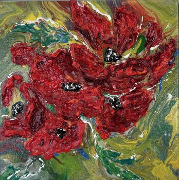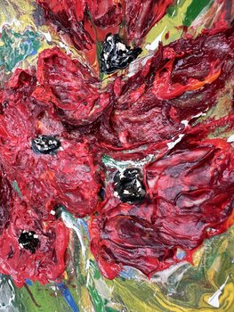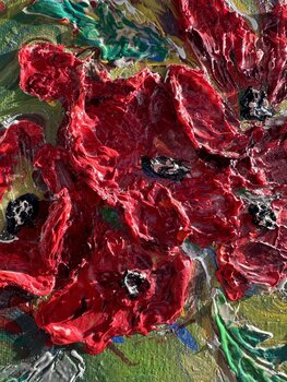 "Windy Poppies" è un dipinto astratto strutturato costituito da pennellate di impasto spesse e audaci. Tratti rosso vivo formano il focus centrale, creando l'impressione di papaveri in fiore, con accenti bianchi e neri che suggeriscono i centri dei fiori. Intorno al motivo floreale ci sono turbinii di verde, giallo, bianco e sfumature di blu, che evocano il fogliame e l'ambiente screziato di luce in cui sono incastonati i fiori. La pesante applicazione… di vernice conferisce all'opera d'arte un effetto tridimensionale, aggiungendo profondità e movimento alla composizione. L'uso dinamico del colore e della consistenza conferisce al dipinto un aspetto energico e organico.