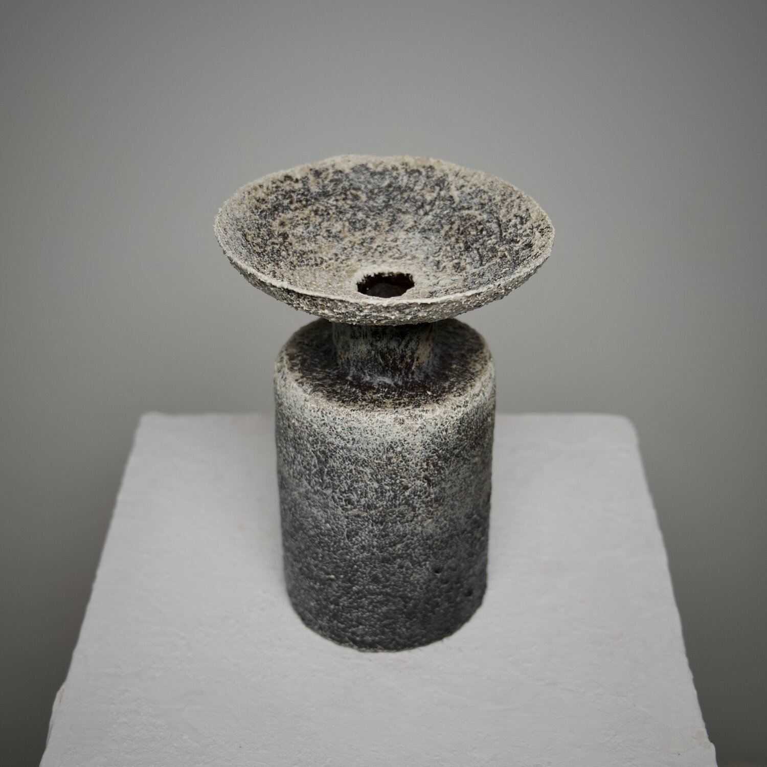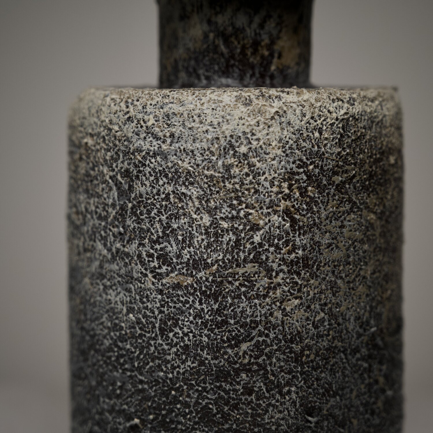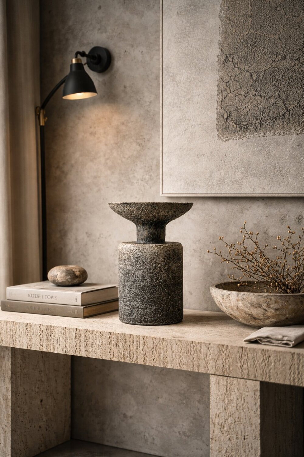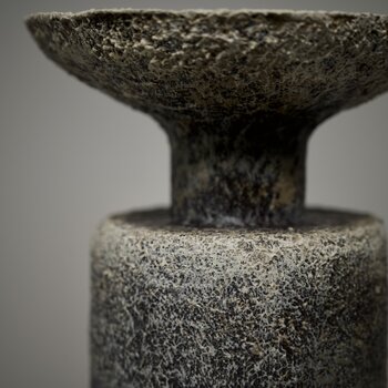 Toni tenui e texture legate alla pietra si insinuano nell'oggetto.