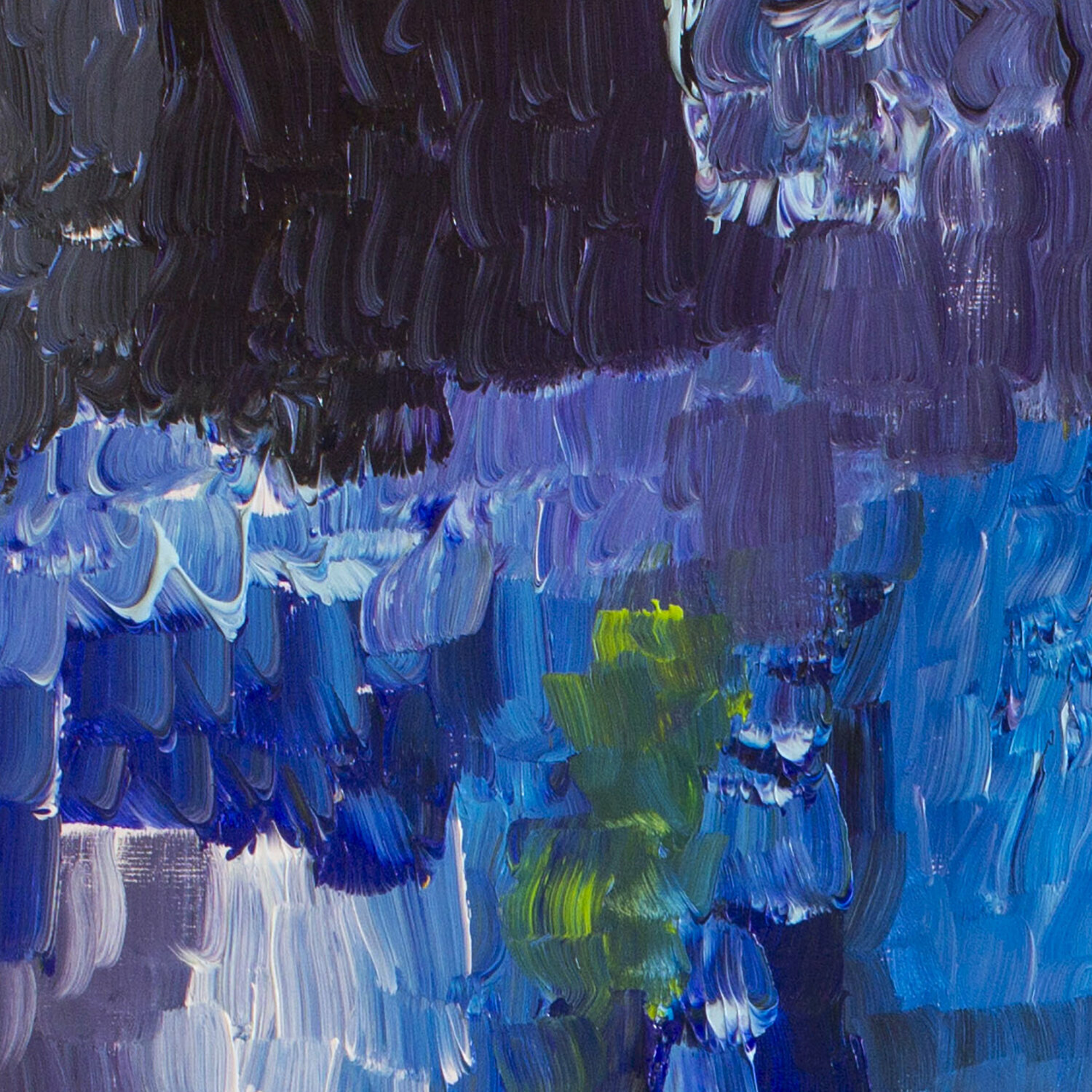 In questo audace dipinto astratto, uno stato emotivo con una sensazione piuttosto fredda e distante viene trasmesso attraverso l'uso prominente dei colori verde e blu. Questi toni freddi evocano un senso di calma, distacco e forse anche malinconia.
