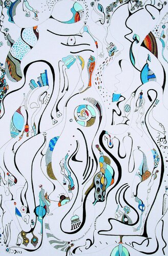 Parte della mia prima serie Tourlicoulis, questo dipinto è stato realizzato utilizzando pennarelli a olio su tela. La serie mette in mostra personaggi stravaganti, ognuno vibrante e pieno di attività. In questo pezzo, un aquilone astratto ornato di punti blu spicca tra le vivaci figure di Tourlicoulis, fondendo l'essenza giocosa della serie con dettagli intricati.