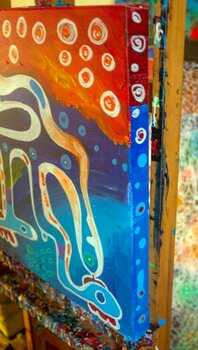 In questa stravagante opera d'arte, gli spettatori vengono trasportati in un regno onirico dove le bolle fluttuano pigramente attraverso la vasta distesa dello spazio. A dominare la tela è una figura bianca prominente ed eterea, che rappresenta una persona ritratta in uno stato di delicato equilibrio. La turbolenza di questa dimensione onirica fa sì che la figura si tenga ai piedi con le mani, creando un loop visivo giocoso e intrigante. La scelta… di ritrarre la figura in questa posa unica evoca sentimenti di vulnerabilità, fantasia e un tocco di surrealismo, attirando maggiormente l'osservatore nell'universo immaginato dall'artista. I bordi del dipinto sono dipinti.