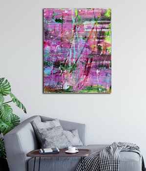 Pioggia blu, azzurro, verde, verde acqua, viola, rosa e arancione. Questa opera d'arte è piena di luminanza e azione. Firmato davanti. Pronto da appendere.