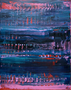Colorfield astratto con sfumature scure e anche molta luce. Rosso, rosa e blu attenuati dal verde acqua scuro. Questo dipinto arriva montato in una tela di legno, i lati dipinti, firmati di fronte.