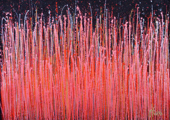 Espressivo astratto moderno, audace pieno di vita, lucentezza e luccichio! ispirato alla natura, molte sfumature e sfumature di rosso combinate con particelle di mica su sfondo nero scuro. firmato davanti con inchiostro d'oro.