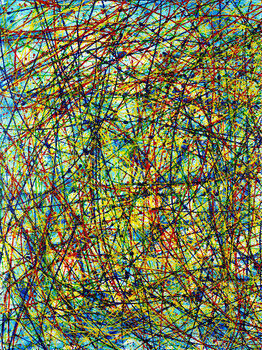 Pittura astratta espressionista con pioggerelle sincronizzate in blu navy, giallo, vernice trasparente iridescente, verde, rosso e molta iridescenza su blu perlato. Completato con movimento gestuale ed energia. Può essere visualizzato in più orientamenti. Firmato sul retro o sul fronte su richiesta.