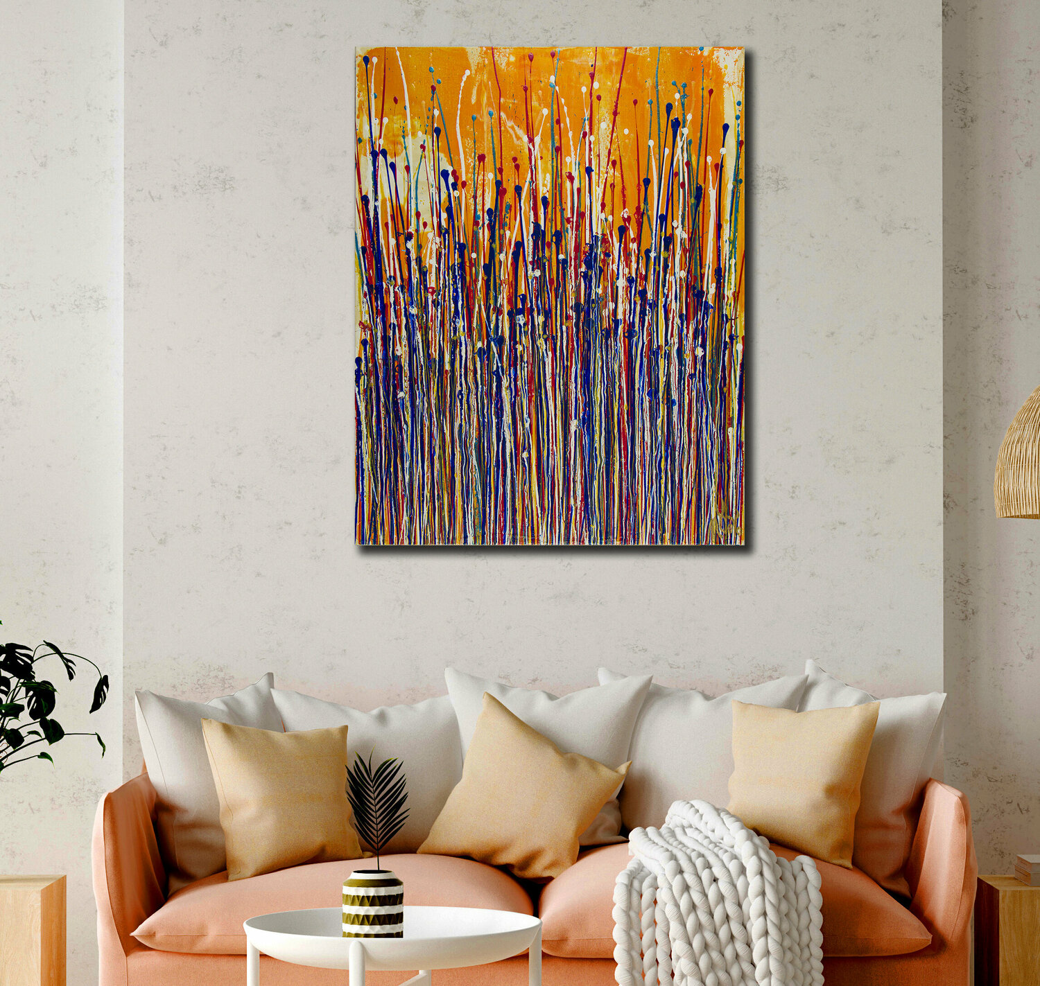 Espressivo astratto moderno, audace pieno di vita, lucentezza e luccichio! ispirato alla natura, molte sfumature e tonalità, rosso, azzurro, blu, giallo, arancio e rosso combinato con particelle di mica sull'arancio. firmato davanti con inchiostro d'oro.