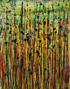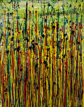 Espressivo astratto moderno, audace pieno di vita, lucentezza e luccichio! ispirato dalla natura. Sfumature di verde, rosso, giallo e viola scuro su verde. firmato davanti con inchiostro d'oro.