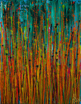 Astratto moderno espressivo, audace pieno di vita, lucentezza e luccichio! ispirato dalla natura. Sfumature di rosso fluo, giallo, arancione e verde su verde ottanio. firmato davanti con inchiostro d'oro.