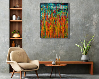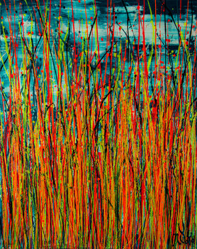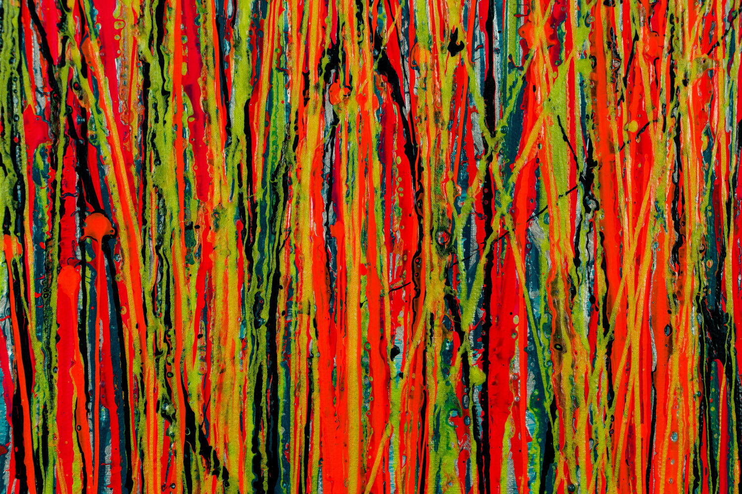 Espressivo astratto moderno, audace pieno di vita, lucentezza e luccichio! ispirato dalla natura. Sfumature di rosso fluo, giallo e verde su verde acqua. firmato davanti con inchiostro blu.