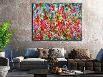 mpactful dichiarazione pittura astratta, immagini audaci, pennellate di spatola, vibrante su blu scuro e verde. Una vera esplosione di colori cangianti. Rosa vivido, giallo, viola, viola iridescente (riflettente), verde acqua e verde. Questa opera d'arte arriva montata in una cornice di legno pronta per essere appesa, firmata davanti!