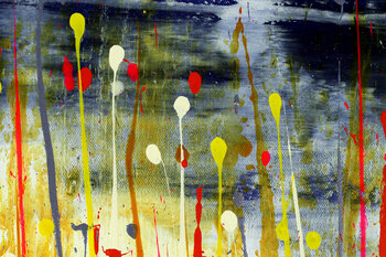 Pittura astratta moderna con molte pioggerellina dinamica in giallo, rosso, blu su bianco argento e indaco. Firmato davanti.
