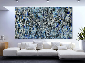 Questa opera d'arte è stata creata sovrapponendo e mescolando strati sottili di blu, argento e nero con particelle di mica iridescenti con l'idea di portare la massima profondità e armonia in primo piano.