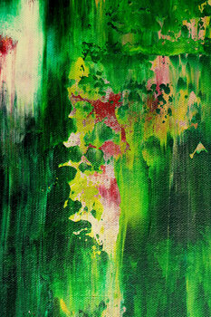 Pittura di paesaggio contemplativa audace con miscelazione di colori vibranti, contrasto e dettagli. Strutturato con strati di vernice trasparente verde, verde oliva, beige, iridescente e sfumature terrose.