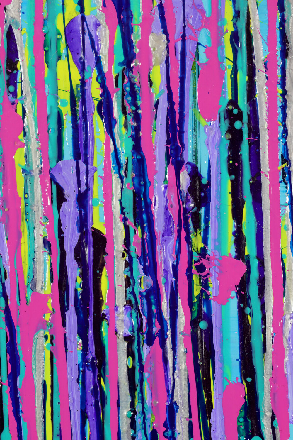 La tela si apre con una sorprendente tavolozza di vivaci blu, gialli, viola e tocchi di arancione, rosso e verde, su uno sfondo dinamico di nero e argento. Questi colori luminosi si riversano in cascate di striature e spruzzi verticali, creando un effetto simile a quello di un giardino con steli alti e ondeggianti che si inclinano verso destra, suggerendo crescita e direzione. L'applicazione espressiva di acrilico e tecniche miste, con gocce e schizzi, aggiunge consistenza e movimento, trasformando il dipinto in una celebrazione visiva di colore e armonia.