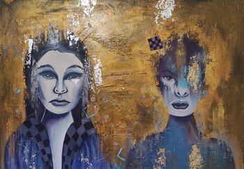 In questa opera, ho esplorato le texture e i contrasti fra la concretezza del cemento e il lusso delle foglie d'oro e d'argento. La tensione tra astratto e figurativo si manifesta nei volti, che emergono quasi come apparizioni surreali da uno sfondo tumultuoso. Ogni dettaglio è un dialogo su identità e metamorfosi, invitando chi guarda a riflettere sulla propria maschera nell'arte e nella vita. L'energia di questo quadro trasformerebbe qualunque… spazio, aggiungendovi un tocco di mistero e riflessione profonda.