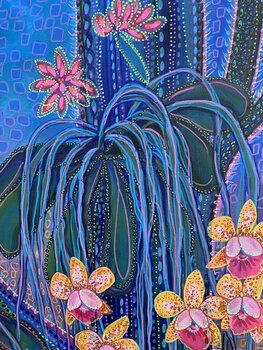 In questo dipinto ho cercato di catturare la bellezza eterea delle orchidee sotto il velo della notte. Usando gli acrilici, ho sovrapposto tonalità vibranti e motivi intricati per evocare un senso di meraviglia e mistero. I blu e i verdi tremolanti contro i rosa tenui e i gialli creano una qualità onirica, invitando lo spettatore a entrare in un giardino tranquillo e ultraterreno. Questo pezzo simboleggia la silenziosa resilienza della natura, che… fiorisce nel silenzio ma esplode di vita.