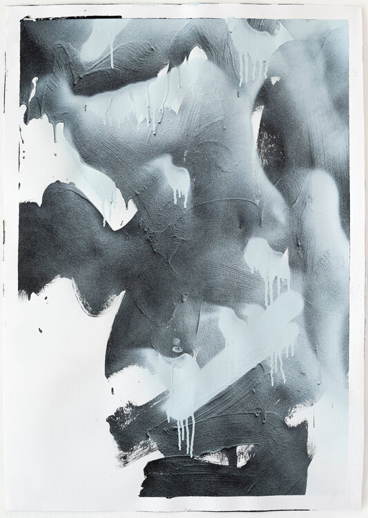 Ogni dipinto richiede una diversa quantità di tempo per essere completato. Mi è piaciuto molto vedere come la vernice spray mettesse in risalto i volumi del colore nero. Era come se all'improvviso potessi vedere attraverso il blues e osservare ciò che ieri era invisibile nel buio.