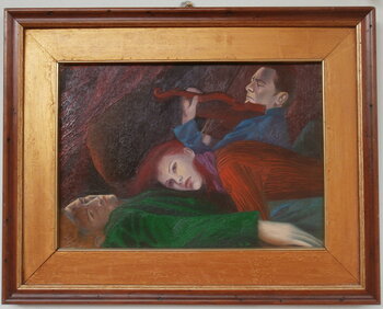 Opera in cui l'olio danza con emozione pura, creando una sinfonia visiva di colori caldi e forme che sfiorano il realismo e l'espressionismo. Ogni pennellata racconta di sentimenti intensi e di una narrativa vivida, quasi come se la musica potesse emergere dal silenzio dei soggetti ritratti. Le figure umane si intrecciano in un abbraccio con la musica, evocando una passione che risveglierà ogni parete con energia e anima.