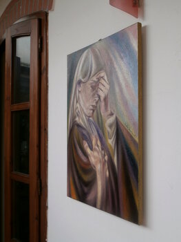 Dipinto in cui ho ideato il ritratto immaginario di Santa Caterina da Siena, patrona d'Italia e d'Europa, nel momento che, dopo anni di preghiere e penitenze, riceve all'età di 16 anni (1363) l'abito domenicano del Terz’ordine (Mantellate, laiche) nella sua cameretta, molto spoglia, dove conduce per alcuni anni vita di penitenza. Nella mia opera ho cercato di catturare l'essenza della contemplazione e del profondo sentimento spirituale. Con l'olio… ho modellato la luce e il colore per rappresentare la Santa assorta in preghiera, esprimendo una fusione tra realismo e un tocco di espressionismo. Un'energia serena e riflessiva emana dalla tela, offrendo all'osservatore un momento di pace interiore da portare nella propria casa.