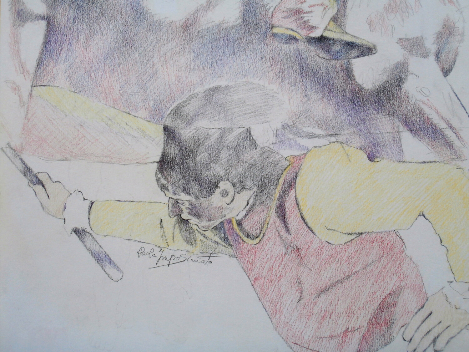 Disegno a matite colorate su cartone in stile figurativo contemporaneo ispirato alla figura di un fantino in procinto di gareggiare in sella al suo cavallo. L'imponente prospettiva svetta dal basso verso l'alto dominando la scena che si apre con lo sbandieratore in primo piano: egli innalza il vessillo, sfumato sul soggetto equestre che si staglia nell' opera.
