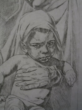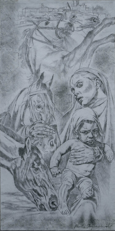 Disegno a matita su cartone in stile figurativo contemporaneo ispirato all'ippoterapia, una sincronia magica e perfetta che si può instaurare col cavallo, per di più creata anche in contatto con la natura. La madre col suo bambino ritratti nell'opera, si trovano completamente immersi in un'intima connessione con i destrieri, relazione in grado di indurre una risposta emozionale benefica nella qualità della vita.