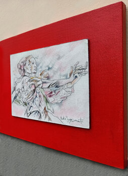 Nella creazione di quest'opera ho lasciato che passione e movimento scorressero liberi, fondendo acquerelli, matita, smalto e inchiostro per catturare l'essenza dell'espressionismo e il dinamismo delle forme, tra tocchi di realismo. E' una danza sulla tela, che unisce storia e fantasia, divenendo icona di passione e vigore, ispirata alla forza del rosso e all'emblema del tango. Ballo dalle movenze sinuose, eleganti e passionali, ancestralmente nutrito… da una malinconia di fondo a cui si reagisce con una vitalità carnale e dolente che afferma l'esistere. Rosso è tango. Questo dipinto è un invito alla celebrazione emotiva, in grado di infondere energia e carattere in ogni spazio con la sua vibrante vitalità.
