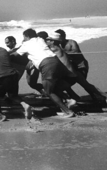 L'immagine fa parte del volume 'Terre di Mare - Sea Land' pubblicato nell'agosto 2025 (acquistabile on line, www.editorepavia.it). E' stata scattata mentre eravamo su una spiaggia tra Lisbona e Porto, quando sono scesi gli uomini di un piccolo borgo vicino che, chiaramente allenati, hanno messo in mare un grande gozzo che avrebbe calato la rete per pescare tantissime sardine, divise poi sulla spiaggia con tutti gli abitanti. La foto è stata scattata… nel momento di maggior spinta come testimoniano i muscoli tesi di spalle e gambe. Fotocamera Canon F1, obiettivo 50mm Canon, pellicola ILFORD FP4.