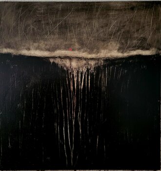 Tecnica: colori acrilici, smalto, bitume e cenere su tela incollata su pannello di legno.