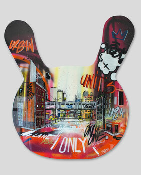 Opera dell'artista Pappay realizzata su legno. Universo molto urbano e street art con questa strada in prospettiva di una tipica città americana dai colori molto sgargianti. Forma originale e molto pop che ricorda una testa di coniglio stilizzata. È stata aggiunta una resina di finitura per conferire all'opera un aspetto ultra brillante.