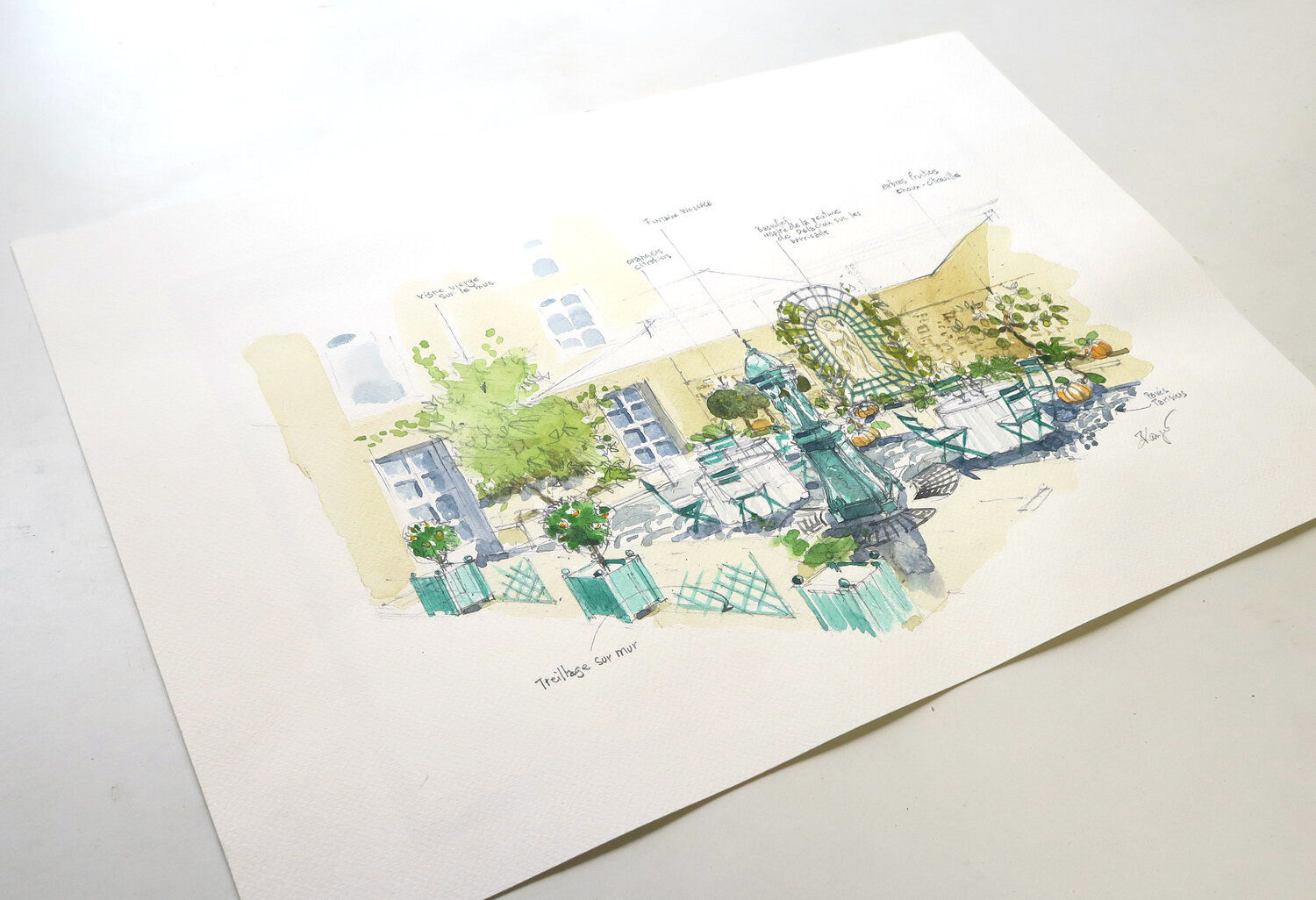 Questo è un acquerello che raffigura il cortile di un piccolo hotel a Montmartre. Ho progettato l'impaginazione e creato l'acquerello per la presentazione del progetto al cliente.