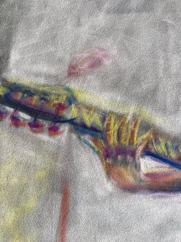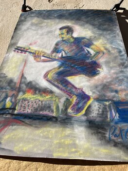 Ispirato da Calogero e dal suo volo sul palco, ho cercato di catturare l'essenza vibrante e l'energia elettrizzante della sua musica. Usando i pastelli per mescolare fauvismo e street art, ho proiettato il dinamismo e la passione di un chitarrista in piena performance, in assenza di gravità! I colori vivaci e i movimenti fluidi evidenziano le vibrazioni emotive che fuoriescono dalla sua chitarra!