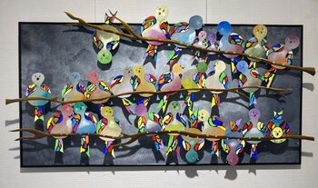 Leggerezza e buon umore emanano da questa composizione che ci invita a sorridere e a immaginare le conversazioni segrete dei nostri uccelli.