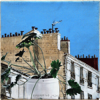 Paul Bagnulo, pittore e incisore con una formazione in graphic design e multimedia, lavora principalmente con acrilico, inchiostro, collage e materiali di recupero. Il suo stile figurativo trasforma le forme astratte dei tetti parigini – comignoli e cornicioni – in composizioni vibranti, fondendo un'osservazione precisa con tecniche sperimentali. La sua arte trasmette un senso di meraviglia e una viva ammirazione per la semplicità urbana, invitando gli spettatori a un'esplorazione estemporanea e carica di emozioni della bellezza quotidiana.