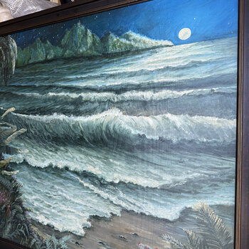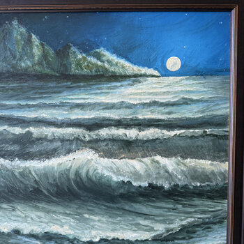 Nel realizzare questo paesaggio marino, ho cercato di catturare la potente tranquillità dell'oceano al chiaro di luna. Utilizzando colori acrilici, ho enfatizzato la fluidità e la consistenza delle onde, la loro danza ritmica contro la riva serena. La tenue luce lunare inonda la scena, esaltandone l'eleganza naturale e infondendo un senso di calma. Spero di evocare sentimenti di stupore e pace, portando l'essenza rilassante del mare nella vostra… casa.