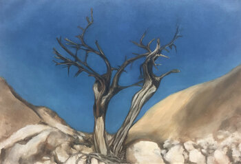 Due boschi gemelli rimangono in piedi dalle crepe nel deserto. Sembrano desolati, desolati e appassiti. Ma stanno sostenendo in una terra asciutta senza vegetazione. Significano forza, resilienza e rinascita.