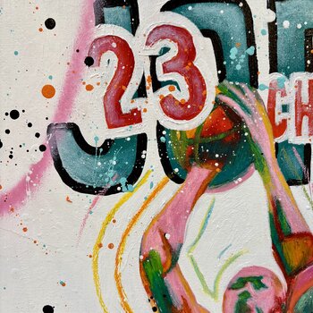 Questo dipinto vibrante e dinamico rende omaggio all'icona del basket Michael Jordan. Attraverso uno stile di street art che mescola graffiti e schizzi di vernice, cattura l'intensità e la leggenda del numero 23 dei Chicago Bulls. I colori vivaci e le pose iconiche illustrano il suo dominio in campo e il suo impatto culturale senza tempo.