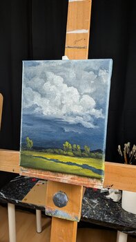 In quest'opera ho riversato tutta la mia anima nel catturare la tensione tra calma e tempesta. Le nuvole vorticose, realizzate con pennellate dense di olio, evocano l'energia primordiale della natura, mentre il sereno paesaggio sottostante ancora lo spettatore alla realtà. Volevo che questo dipinto portasse una presenza potente e dinamica nel vostro spazio, un promemoria che anche nella quiete si cela una tempesta di emozioni pronta a scatenarsi.