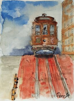 In quest'opera vibrante, ho riversato le mie emozioni in espressive velature di acquerello e linee di inchiostro per catturare lo spirito dinamico di un tram cittadino che sale su una ripida strada. I rossi e i blu intensi evocano l'energia e la tensione della vita urbana, mentre le pennellate fluide e libere trasmettono movimento e attesa. Quest'opera dona un impulso elettrizzante a qualsiasi spazio, invitando gli spettatori a sperimentare il movimento… puro e il fascino del viaggio quotidiano.