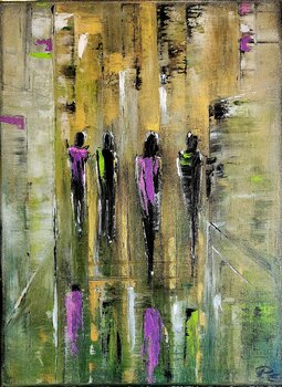 Ho creato quest'opera d'arte utilizzando colori ad olio in uno stile semi-astratto, catturando l'energia e il movimento del nostro mondo urbano. Le figure, raffigurate con contorni audaci e riflessivi, simboleggiano la diversità e la misteriosa interazione dei percorsi umani. Con il gioco di luci e ombre, vorrei stimolare una riflessione sull'isolamento e sul cameratismo nel nostro trambusto quotidiano, lasciando trasparire la profondità strutturale… e i colori emotivi. Questa immagine porta un'energia vibrante e premurosa in ogni stanza.