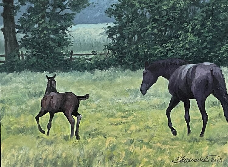 Questo delicato dipinto a olio cattura il tenero legame tra cavalla e puledro. La rappresentazione serena e realistica riflette sia la sicurezza che la libertà che ho provato osservando i due Hannover al mattino presto. Quest'opera porta un'energia armoniosa nella vostra casa, un invito alla tranquillità e alla meraviglia per la bellezza della natura.