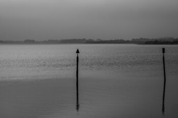 In un braccio di mare deserto per l'inverno, questi due marcatori laterali sono la traccia degli sforzi compiuti dall'uomo, generazione dopo generazione, per rendere più sicura e semplice l'esplorazione di questa natura. In estate guidano i marinai in mare aperto. Quel giorno guidano lo sguardo… verso la natura immutabile, resa misteriosa da un leggero velo di nebbia. La scelta del bianco e nero per questa foto venata di minimalismo aggiunge un tocco di eleganza.