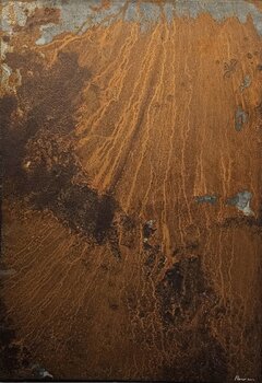 L'opera integra l'uso di materie non convenzionali (lamiere arrugginite) con pasta e colori che creano lo sfondo arricchito da altri materiali che aggiungono matericità.