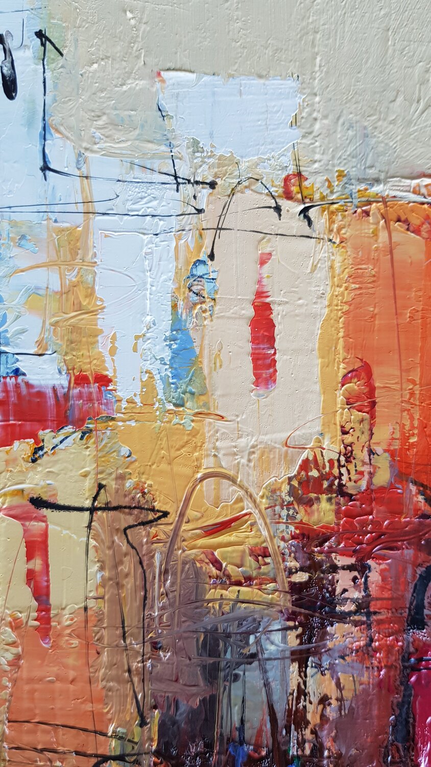 In questo lavoro combino elementi astratti con pennellate espressive. Utilizzo la pittura ad olio per evidenziare vivacità e consistenza, trasportando lo spettatore in un paesaggio urbano semi-astratto e impressionista. Il mio obiettivo è catturare l’energia e la vita vibrante della città. Rossi appassionati, blu rilassanti e neutri terrosi si uniscono per creare una sinfonia armoniosa che infonde nella tua casa un'atmosfera di ispirazione e riflessione.