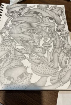 Nel creare questo pezzo, ho esplorato la fluidità e l'interconnessione delle forme astratte, consentendo a ogni forma di crescere organicamente nella successiva. Il mio obiettivo era quello di evocare un senso di curiosità e introspezione, invitando gli spettatori a interpretare le loro connessioni personali con gli elementi armoniosi e conflittuali. Questa opera d'arte, realizzata a matita su carta, fonde componenti di stili astratti ed espressionisti,… creando una dinamica che sfida e soddisfa l'occhio. Offre una presenza senza tempo, assicurando che emani un'energia contemplativa e serena in ogni casa.