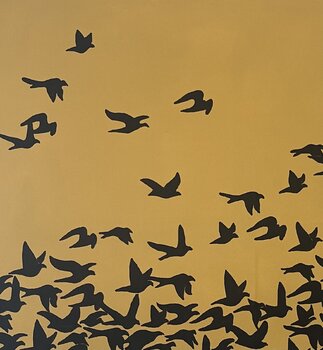 Il dipinto acrilico su tela, di forma quadrata e ridotto ai soli due colori nero e ocra, dispiega un effetto suggestivo, quasi meditativo. Gli uccelli sono raffigurati come sagome, nitide e ad alto contrasto. Il denso e dinamico stormo di uccelli nella parte inferiore del dipinto si dissolve verso l'alto, a dimostrazione della forza e della vitalità di tutta la comunità.