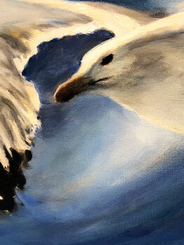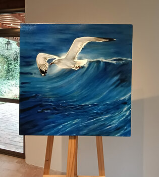 Ho voluto dipingere quest'Opera non solo perché amo il mare e il sentimento di Libertà che provoca in me, ma per il desiderio di voler generare un cambiamento nella mia vita, riconoscendo che a volte per raggiungere quel porto desiderato, hai essere disposti, sentirsi liberi, fidarsi della nostra scelta come questo Gabbiano e andare oltre… il conosciuto.