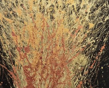 Un'esplosione di luce scaturisce dal centro della tela su uno sfondo nero intenso. Linee, schizzi e pennellate di bianco, oro e rosso si espandono… verso l'alto come fiamme, scintille o un cespuglio ardente. L'oro e il bianco dominano la parte superiore, mentre un rosso intenso si innalza dal basso, creando una gradazione di energia che passa dal fuoco alla luce pura.