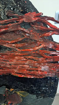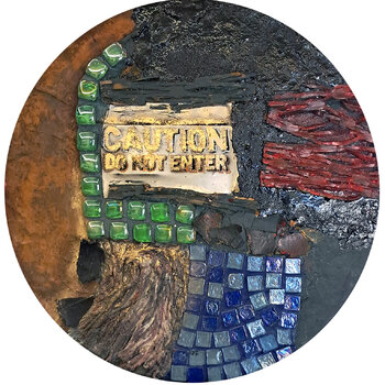 Quest’opera circolare in tecnica mista è un viaggio visivo e tattile attraverso materia, colore e simbolismo. Ogni sezione del lavoro racconta una storia distinta: dal fuoco stilizzato in rosso che evoca energia e trasformazione, al messaggio “CAUTION DO NOT ENTER” che introduce una riflessione sul limite e il divieto. Le tessere blu e verdi, disposte in onde, suggeriscono movimento e fluidità, mentre la corteccia scolpita nella parte inferiore richiama… la forza e la memoria della natura. Il contrasto tra superfici ruvide, lucide e scolpite crea un dialogo dinamico tra elementi artificiali e organici.