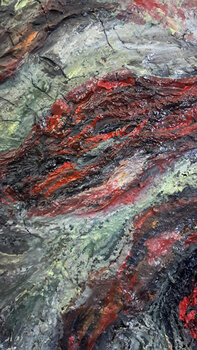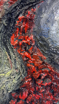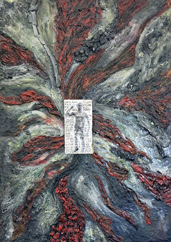Epicentro della Memoria è un’opera potente e materica che fonde astrazione e narrazione in un’esplosione visiva e concettuale. Al centro della composizione, una deflagrazione di texture tridimensionali in rosso, nero, grigio e bianco evoca la forza primordiale di un’eruzione vulcanica o di un evento tellurico. Le linee e le creste che si irradiano dal nucleo creano un senso di movimento e tensione, come se la tela stessa fosse attraversata da energie… sotterranee.