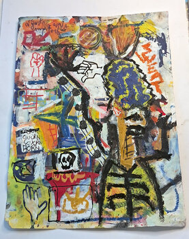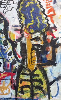 La composizione richiama il linguaggio della street art e del neo-espressionismo: linee istintive, stratificazioni di colore e segni grafici che ricordano… graffiti urbani e antiche incisioni.